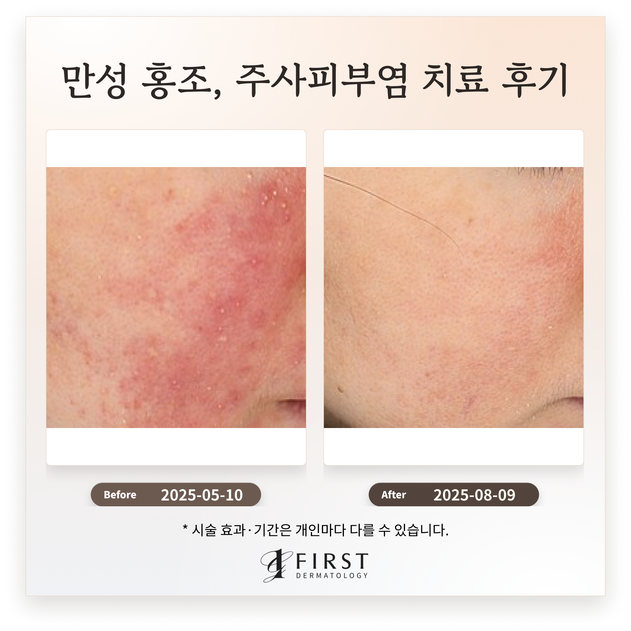 혈관축소레이저 및 PRP 병행 치료 후 얼굴 중앙 부위의 지속적인 붉은 기가 감소하였으며, 동반된 열감 또한 경감되었습니다. 주사피부염의 간헐적 악화 빈도가 줄어들어 전반적인 피부 상태가 안정화되었습니다.