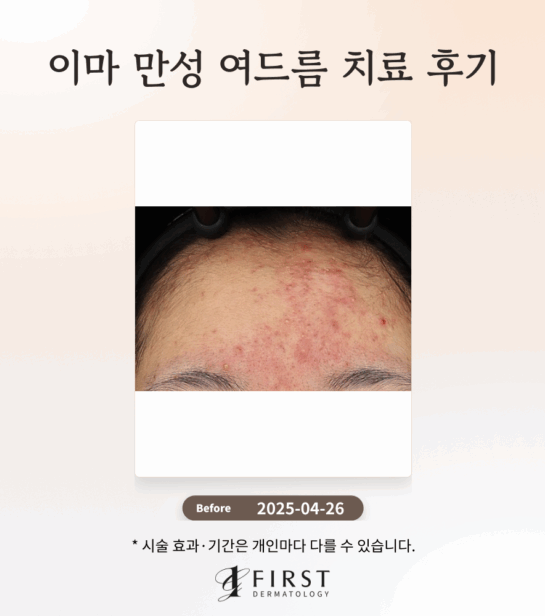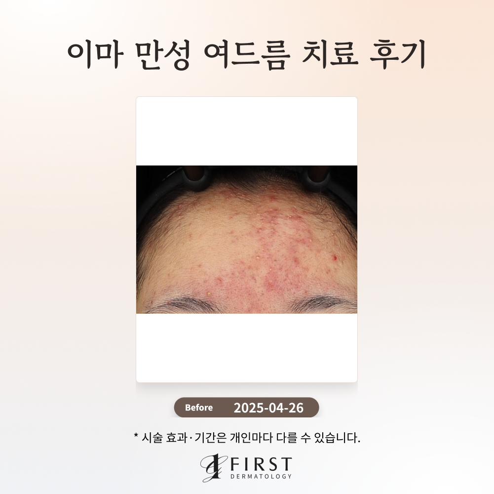 오랜 기간 이마 부위에 지속된 여드름으로 인해 염증성 병변과 면포가 다수 관찰되며, 이는 피부 결을 고르지 못하게 만들고 있습니다. 여드름 압출과 피지선 축소 치료는 현재 관찰되는 면포를 제거하고, 과도한 피지 분비를 조절하여 여드름 발생의 근본적인 원인을 개선하는 데 도움을 줄 수 있습니다. 더불어 브이빔 치료는 염증성 병변으로 인한 붉은기를 완화하고, 전반적인 피부 결 개선에 긍정적인 영향을 미칠 수 있습니다.