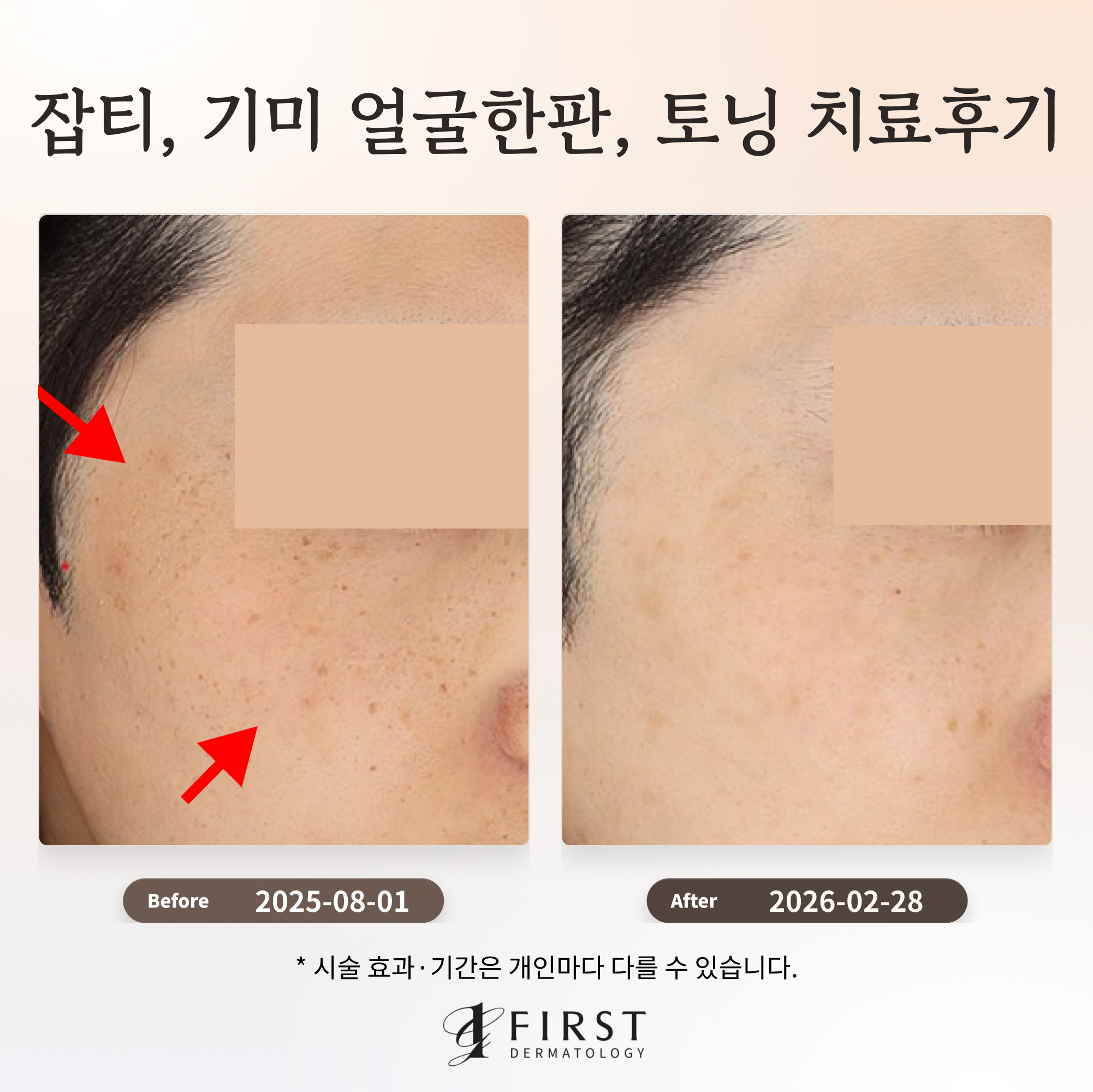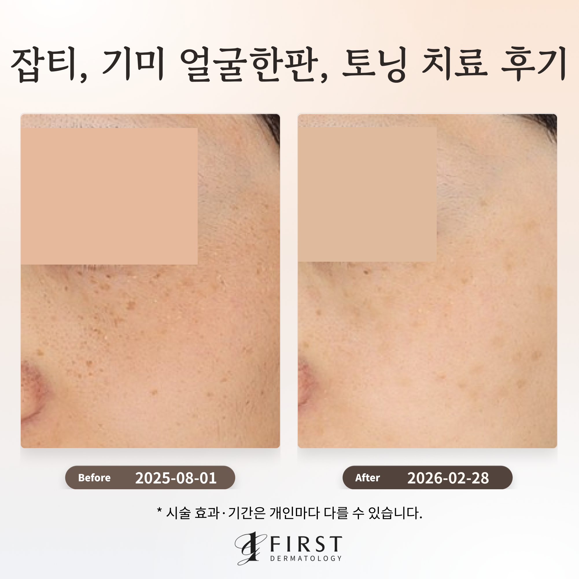 환자분께서는 얼굴 전반에 걸쳐 광범위하게 분포된 잡티와 기미로 인해 피부 톤이 불균일하고 칙칙해 보이는 고민이 있으셨습니다. 얼굴한판 토닝레이저 시술은 볼, 이마 등 주요 부위의 표피층에 위치한 다양한 크기의 색소 침착을 효과적으로 개선하는 데 적합합니다. 듀얼 또는 단일 토닝레이저를 통해 진피층 내 위치한 색소를 정교하게 타겟하여, 전반적인 피부 톤을 균일하고 맑게 만드는 데 도움을 드릴 수 있습니다.
