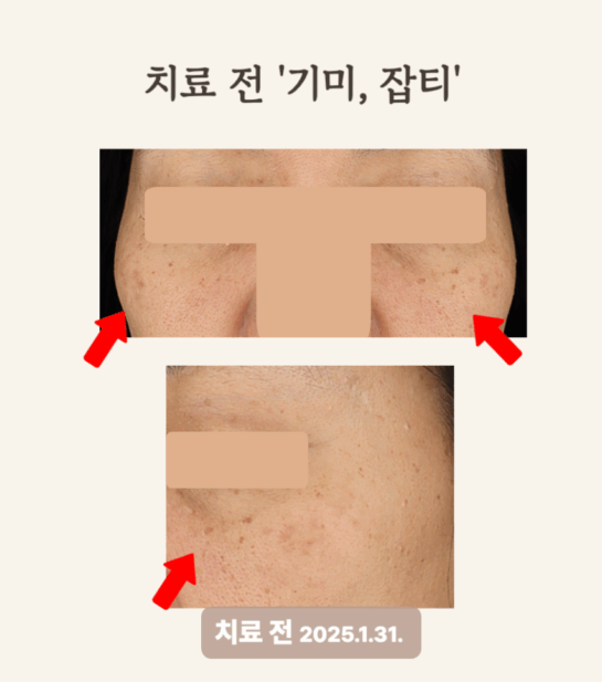 ① 잡티: 피코토닝으로 제거 ② 기미: 진피색소에 레이저토닝 반복 시술