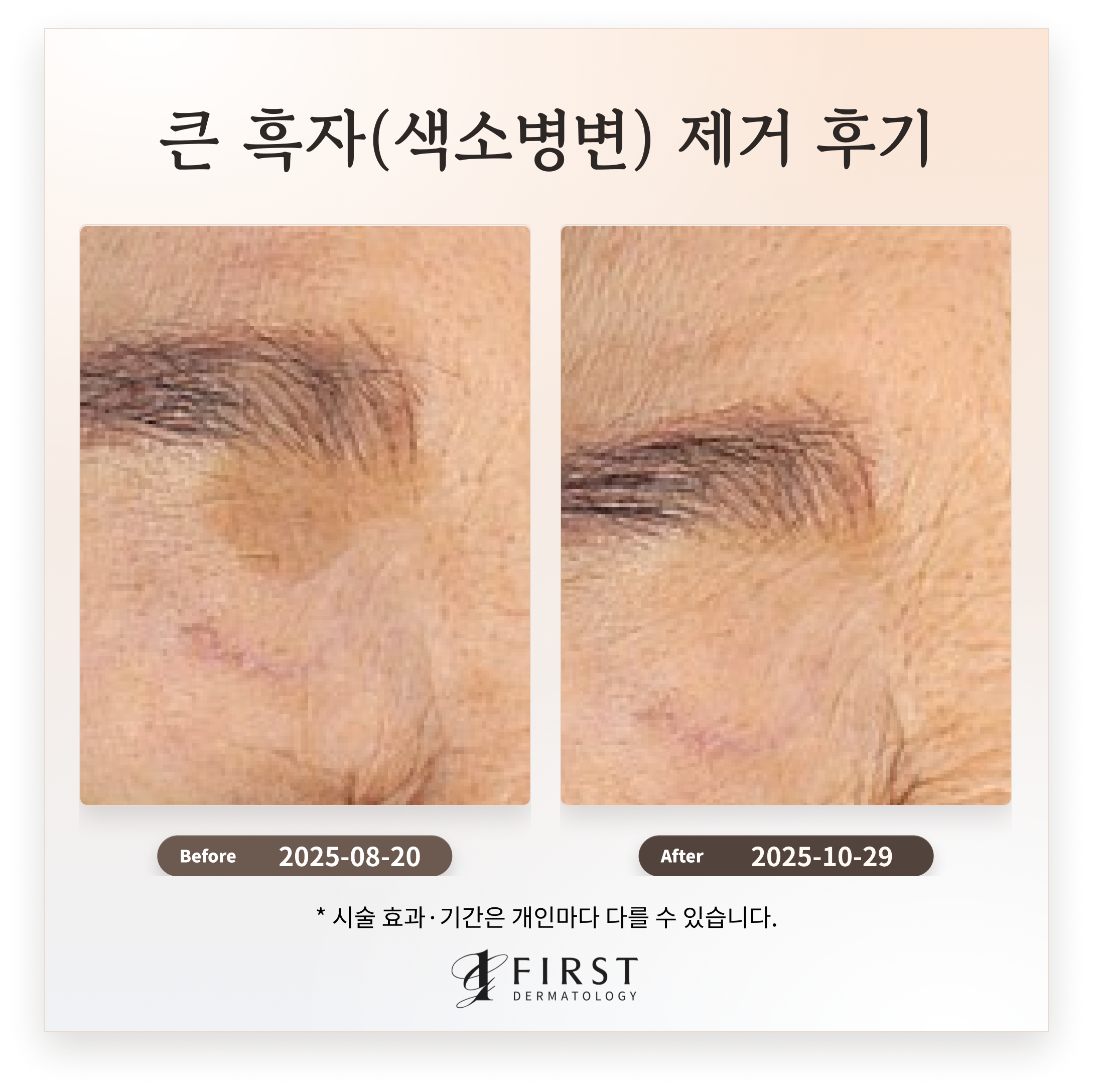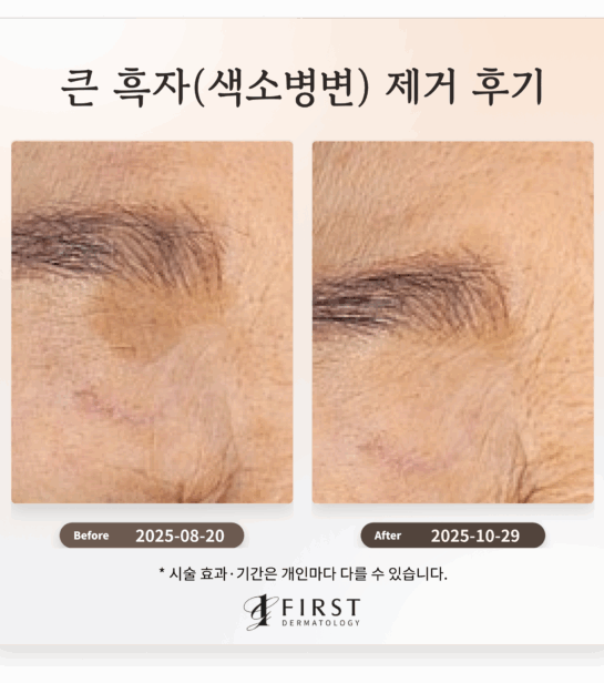 얼굴한판 및 토닝레이저 치료 후, 광대, 볼, 눈 위 등 얼굴 곳곳에 산재했던 크고 진한 흑자들의 개수가 70% 이상 감소하고 색소 농도가 현저히 옅어졌습니다. 전반적인 기미와 잡티의 밀도가 50% 이상 줄어들며 피부 톤이 2단계 이상 밝아지고 균일도가 60% 이상 개선되어, 전체적으로 칙칙하고 얼룩덜룩했던 인상이 크게 호전되었습니다.