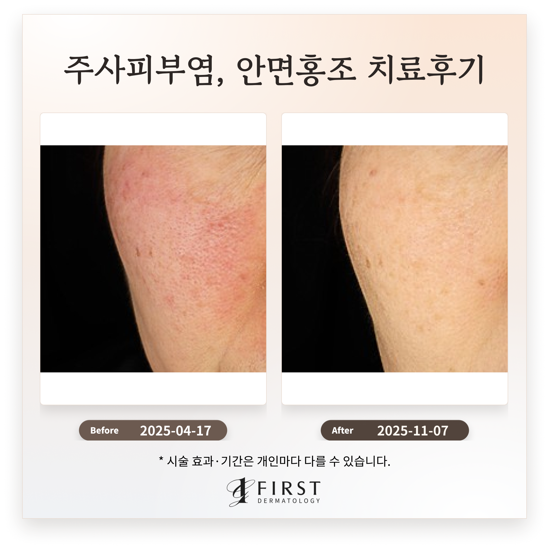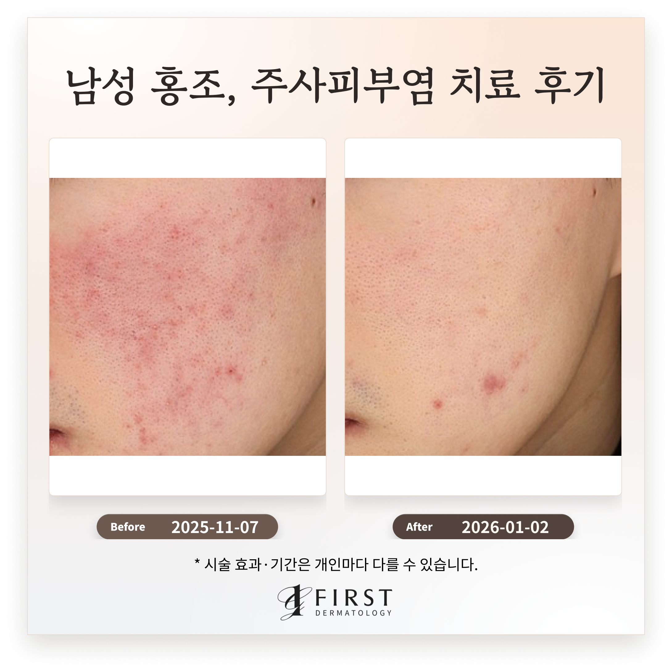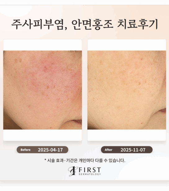 주사피부염 치료 후, 전반적인 안면부의 만성 홍반은 약 50-70% 감소하였으며, 뺨과 코 주변의 혈관확장 및 육안으로 확인되던 모세혈관의 밀도가 감소했습니다. 간헐적으로 동반되던 따끔거림과 열감은 발생 빈도 및 강도가 감소하여, 피부의 전반적인 안정성이 증진되었습니다.